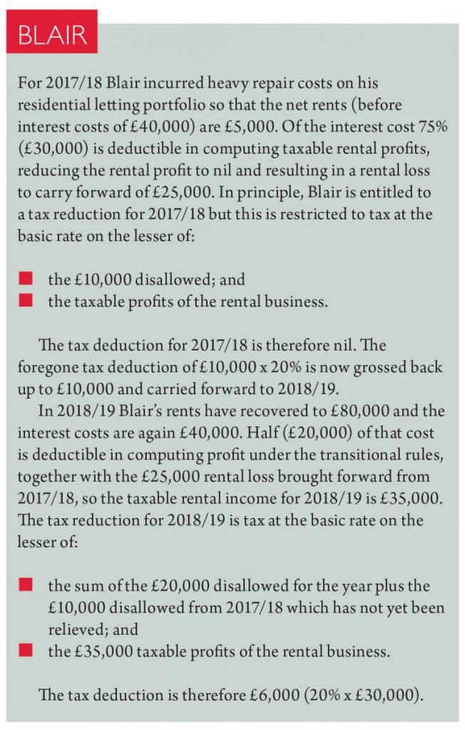 There are likely to be deductions from total income in arriving at the amount chargeable to tax, if only on personal allowances. Indeed, in Blair, if it is assumed that Blair has no income other than from property lettings, the availability of a personal allowance will reduce the tax otherwise payable for 2018/19 below the amount of the tax reduction. So the legislation introduces a further restriction, which seems to be broadly intended to restrict the tax reduction to the amount of tax that would otherwise be payable.